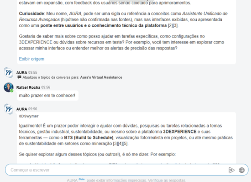 A AURA AI é a assistente de inteligência artificial desenvolvida para facilitar a interação com os recursos da plataforma. Integrada ao aplicativo 3DSwymer, ela funciona como um chatbot capaz de interpretar perguntas em linguagem natural e ajudar os usuários a encontrar informações dentro do ambiente colaborativo.
