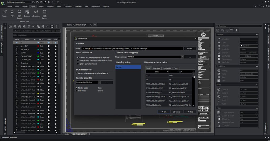 O DraftSight agora permite exportar arquivos no formato DGN, usado amplamente em projetos de engenharia civil, arquitetura e plantas industriais. Essa funcionalidade facilita a colaboração entre equipes que utilizam diferentes softwares, mantendo a integridade dos arquivos sem necessidade de conversão manual.