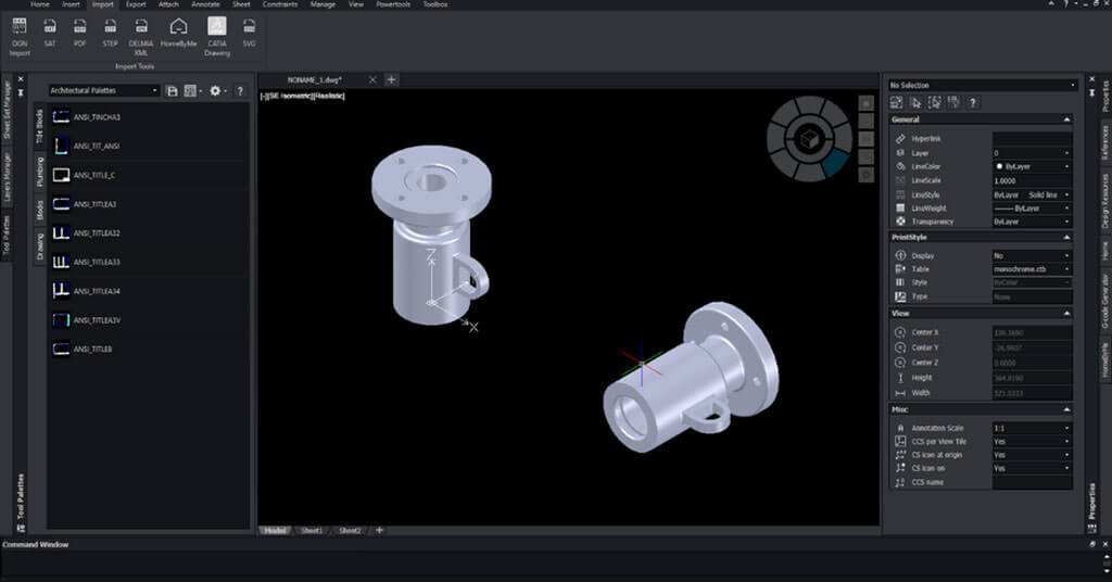 O DraftSight 2025 inclui mais de 400 blocos dinâmicos prontos para uso. Esses blocos, acessíveis por meio das paletas de ferramentas, podem ser ajustados em tamanho, forma e configuração para atender a diversas necessidades de projeto, reduzindo tarefas repetitivas.