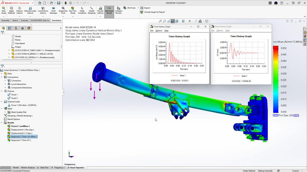 E não para por aí. A análise de tensões estáticas é apenas uma parte de um processo de validação abrangente. Vibrações ressonantes, por exemplo, podem ameaçar a integridade de áreas soldadas ou levar sistemas mecânicos a falhas catastróficas. A análise de frequência e os estudos dinâmicos lineares do SOLIDWORKS Simulation permitem prever e evitar esses riscos visualizando tensões transitórias, deslocamentos e respostas dinâmicas ao longo do tempo.
